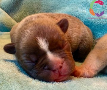 This boy has white markings on his chest and his face. This color chocolate is a less common color.